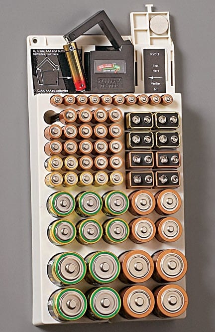 This battery center stores and organizes up to 66 batteries: AA, AAA, C, D, 9V and button cells.