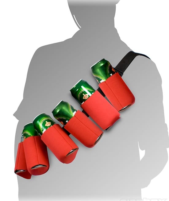 t's a bonanza for the beer drinker: a series of neoprene pouches for cans, all strapped across a bandolier that leaves your hands free for barbecues, football and shootouts. Just stick six of your favourite tins of laughing juice in the sleeves and you're ready to go, flexing the kind of six-pack that really gets attention.