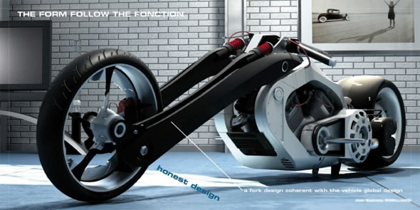A custom motorbike that looks like it came out of a Batman movie. Concept by Jean Baptiste Robilliard.